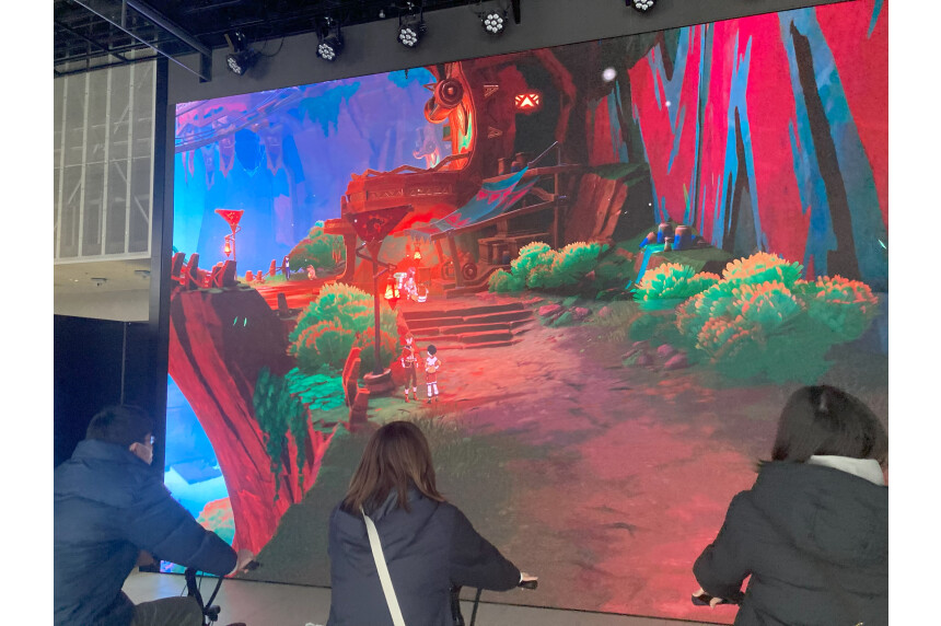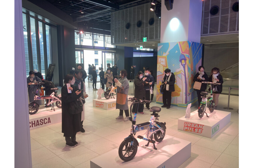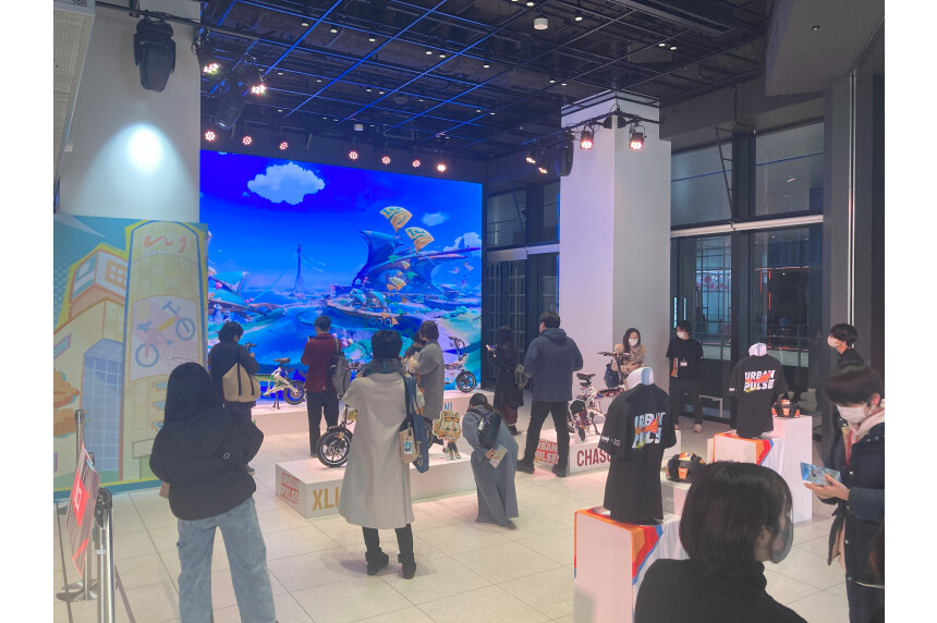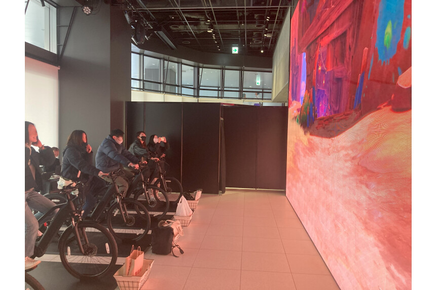 固定された自転車に乗り映像を体験できるインスタレーション、グッズ展示、ノベルティ配布を実施。